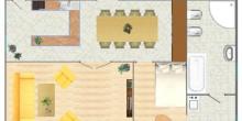 A lakás egy nagy nappaliból, konyhából, hálószobából és egy káddal ellátott fürdőszobából, valamint két kisebb erkélyből áll.
